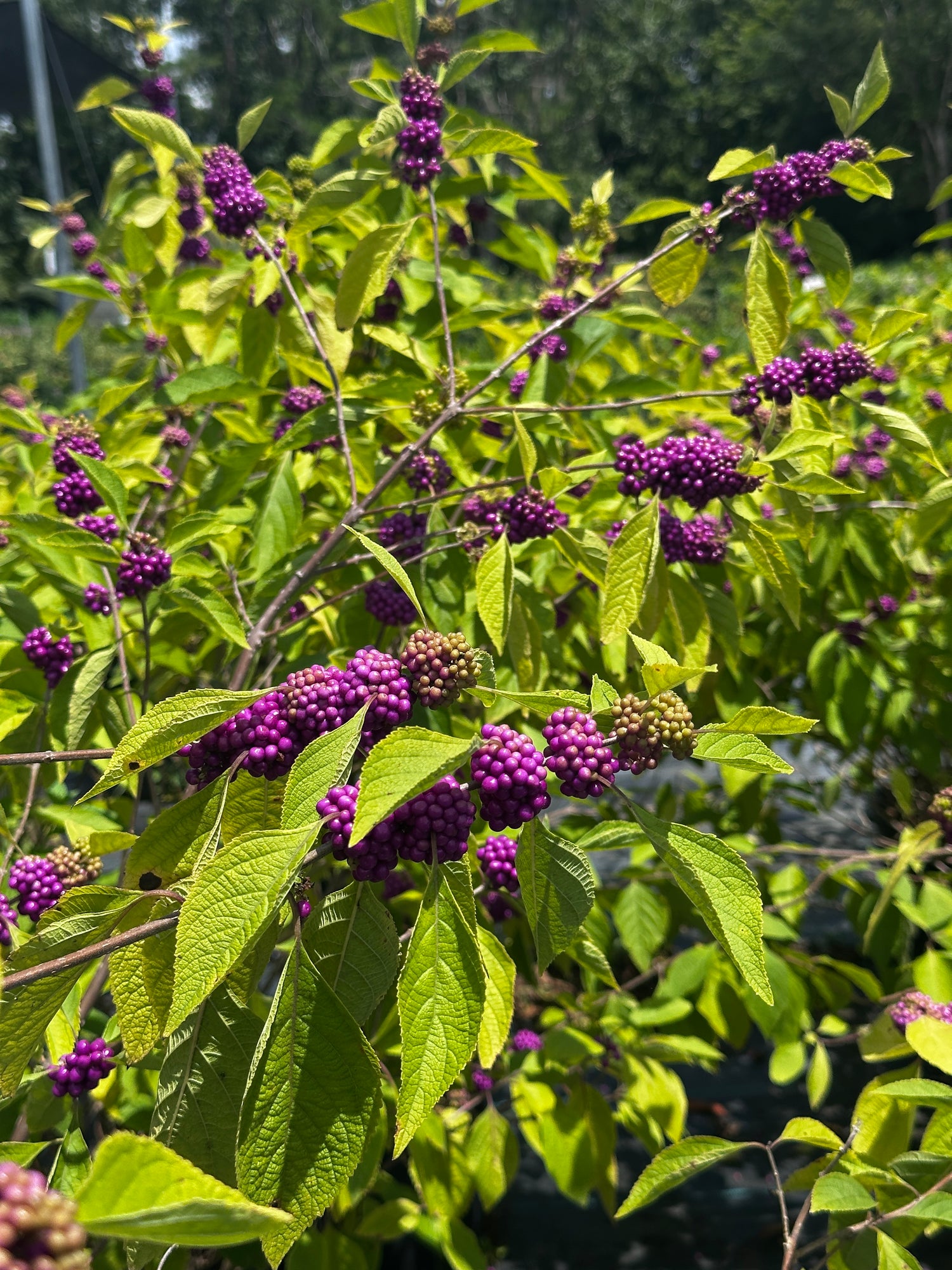 Beautyberry (Callicarpa americana) is a deciduous shrub native to Florida and much of the southeastern United States, celebrated for its striking clusters of bright purple berries that appear in late summer and fall. These vibrant berries, which persist after the foliage drops, create a dramatic pop of color in the landscape and are a favorite food source for birds and wildlife. With its arching branches, soft green leaves, and seasonal showiness, Beautyberry works beautifully as a specimen plant, in mixed borders, or in naturalized gardens.